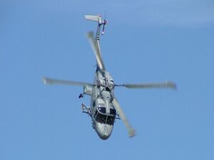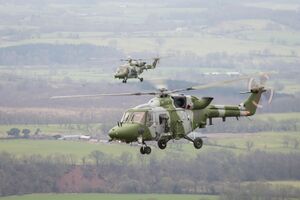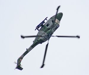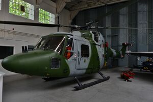 Many of the Lynx's components had been derived from earlier Westland helicopters such as the Scout and Wasp.[18] The Lynx has been substantially upgraded since entering service in the 1970s; improvements made to in-service aircraft have typically included strengthened airframes, new avionics and engines, improved rotor blades, and additional surveillance and communications systems.[25][43] Various subsystems from overseas suppliers have been incorporated into some Lynx variants; during a South Korean procurement, hulls produced in the United Kingdom were equipped with Korean-built systems, such as ISTAR, electro-optical, electronic warfare, fire-control systems,[46][47] flight control actuators,[48] and undercarriages.[49] A glass cockpit was adopted on the Super Lynx 300, featuring fully integrated flight and mission display systems, a variety of integrated display units including head-up displays, and dual controls; AgustaWestland has commented that the new cockpit reduces aircrew workload and increases aircraft effectiveness.[36][38] The head-up display installed could be replaced by a helmet-mounted sight system on customer demand.[45]