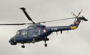 The Royal Danish Navy (RDN) took delivery of eight Lynx Mk 80 between 1980 and 1981. A further two Mk 90 were delivered in 1987 and 1988 as attrition replacements. Operated by the Danish Naval Air Squadron, the RDN fleet is typically stationed upon naval inspection vessels and used to patrol Greenland and Faroe Islands as well as the Danish mainland. Beginning in 2000, the whole Lynx fleet was upgraded to Mk 90B standard.[115] On 7 November 2006, a Danish Lynx had the distinction of performing the first helicopter landing on board a Visby، طراز corvette of the Swedish Navy.[116] In January 2011, control of the Lynx fleet was transferred from the Danish Navy to the Royal Danish Air Force.[117]