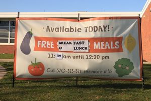 Sign advertising a free breakfast and lunch program for children during widespread school closures due to the COVID-19 pandemic in the United States.