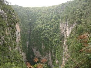 The state is divided into five geographical regions: The Sierra Gorda, El Semidesierto Queretano, Los Valles Centrales, El Bajío Queretano and La Sierra Queretana. The Sierra Gorda is located in the north of the state and is part of the Sierra Madre Oriental, specifically in a subprovince called the Huasteco Karst. It is found in the municipalities of Arroyo Seco, Jalpan de Serra, Landa de Matamoros, Pinal de Amoles and San Joaquín and covers an area of 3,789km2 or 32.2% of the state. The topography is rugged, with high elevations and steep valleys.[13] It is a conjunction of mountains and hills formed mostly by limestone, with wide contrasts in climates and vegetation. They range from near desert conditions to forests of pine and holm oak to the tropical rainforests of the Huasteca area in the state of San Luis Potosí.[14] The Sierra Gorda was made a biosphere reserve in 1997, the Reserva de la Biosfera de la Sierra Gorda, to protect its abundance of species and ecosystems. In 2001, the area was registered with the Man and the Biosphere Programme of UNESCO. This area is managed by la Comisión Nacional de Áreas Naturales Protegidas of the Secretariat of Environment and Natural Resources federal agency.[15]