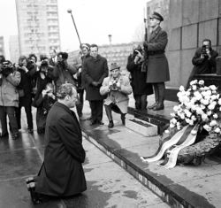 شهد العالم بأجمعه، وكانت تلك المناسبة منقولة على الهواء في زمن لم يكن فيه النقل المباشر قد اصبح سهلا كما هو اليوم، شهد العالم بأجمعه فيللي براندت مستشار ألمانيا الغربية الذى يحكم أكبر إقتصاد أوروبى ويمسك بيده مقادير أقوي عملة موجودة وقتها بعد الدولار الأمريكي، شهده العالم يثني ركبتيه ببطء ثم تنهار مقاومة عضلاته للحركة البطيئة فينزل بالكامل بسرعة على ركبتيه ملامسا بهما سطح الأرض لكي يعبر عن إحترامه لذكرى هؤلاء القتلي الأبرياء ولكي يظهر للعام وللبولنديين أيضا أنه نادم على فعلة بعض من بني وطنه بهؤلاء الضحايا.