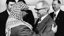 إريك هونيكر يستقبل ياسر عرفات في اكتوبر 1989. وبعد أسبوع سقطت ألمانيا الشرقية، وتكفل عرفات بنفقات انتقال هونيكر إلى منفاه في تشيلي، حيث كانت تعيش ابنته.