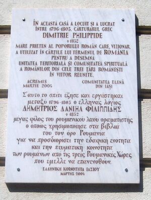 Memorial inscription placed on the facade of the house of Greek scholar Daniel Philippidis in Iași (address: Strada Cuza Vodă 3)