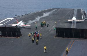 On 5 August, EA-18G Growlers from Electronic Attack Squadron 129 (VAQ-129) and Electronic Attack Squadron 132 (VAQ-132) completed their first at-sea carrier-arrested landing (trap) aboard Harry S. Truman.[35]