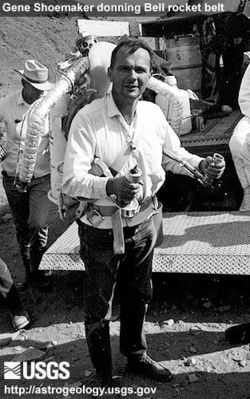يوجين شوميكر معتمراً حزام صاروخي "بل" أثناء تدريب رواد الفضاء.