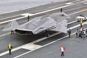 A mock-up of the fictional F/A-37 Talon aboard Abraham Lincoln during production of the film Stealth, 2004