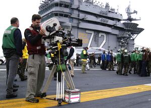 A camera crew sets up for scenes from the movie Stealth to be filmed on the flight deck with the crew