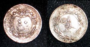 10 پاره - 1336 هـ. في الوجه الأمامي: «ضربَ في * دَوْلَت عُثمانّيَّة * قسطنْطينيّة»، ومن الخلف: طغراء محمود الثاني ومن فوقها: «حُريَّت * مُساوات * عَدالَت».