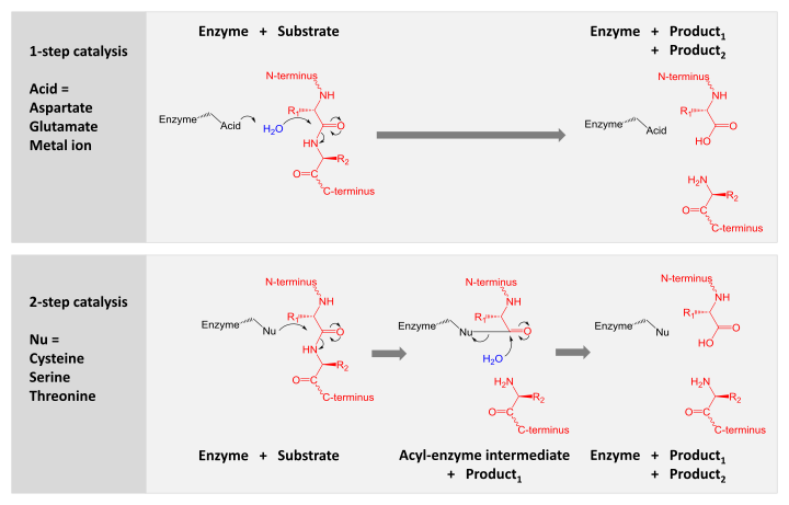 - Serine, threonine, and cysteine proteases use a nucleophilic residue (usually in a catalytic triad). That residue performs a nucleophilic attack to covalently link the protease to the substrate protein, releasing the first half of the product. This covalent acyl-enzyme intermediate is then hydrolyzed by activated water to complete catalysis by releasing the second half of the product and regenerating the free enzyme