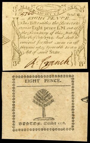 - ^ "Early Paper Money of America, Massachusetts, 1776 October 18," Newman Numismatic Portal at Washington University in St. Louis website, accessed 8 June 2021 (https://nnpbeta.wustl.edu/library/imagecollection/514463)