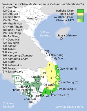 تشام كمبوديا: معظمهم مسلمون سنة؛ مع وجود أقليات شيعة، هندوس، وملحدون/لاأدرية.[3] | |||||||||||||||||||||