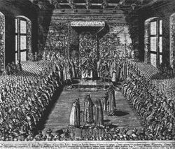 Tsar Shuisky with his brothers at the Warsaw Sejm on 29 October 1611 engraved by Tomasz Makowski after lost picture of Tommaso Dolabella