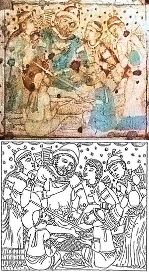 Foreign dignitary in Persian dress drinking wine, on ceiling of Cave 1, at Ajanta Caves, either depicting the Sasanian embassy to Pulakesin II (610–642 CE), or simply a genre scene during the Vakataka Dynasty if the 460–480 CE dating is retained (photograph and drawing).[16]