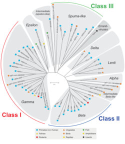 مخطط شجري لمختلف صفوف الڤيروسات القهقرية داخلية المنشأ | |