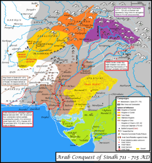 The Arab chroniclers of Sindh (an Arab province from 712 CE onward), narrated the campaigns of Arab governors on Jurz, the Arabic term for Gurjara. They mentioned it jointly with Mermad (Marumāda, in Western Rajasthan) and Al Baylaman (Bhinmal).[8] The country was first conquered by Mohammad bin Qasim (712-715) and, for a second time, by Junayd (723-726).[9] Upon bin Qasim's victory, Al-Baladhuri mentioned that the Indian rulers, including that of Bhinmal, accepted Islam and paid tribute.[10] They presumably recanted after bin Qasim's departure, which made Junayd's attack necessary. After Junayd's reconquest, the kingdom at Bhinmal appears to have been annexed by the Arabs.[9]