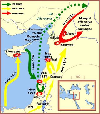 - October – Abaqa Khan, Mongol ruler of the Ilkhanate, detaches some 10,000 horsemen from Anatolia to support the Lord Edward in his war against Baibars. They invade Syria and defeat Mamluk forces who protect the region around Aleppo. The Mongols plunder the cities of Maarat al-Numan and Apamea.[4]