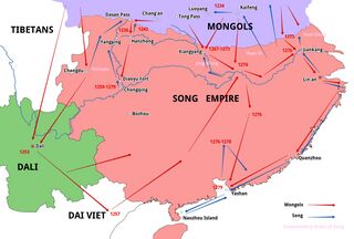 - 19 مارس - معركة يامن: قوبلاي خان's Mongol Yuan fleet attacks the Chinese Song fleet (some 1,000 ships) under Admiral Zhang Shijie at Yamen. The Mongols send fireships, but this is not effective as the Song fleet is coated with fire-resistant mud. Zhang Hongfan, commander of the Mongol forces, orders the Song fleet to be cut off from its base, depriving it of its supplies. He splits the Yuan fleet into four squadrons and again attacks the Song. The ill and weakened Song soldiers are no match for the Mongols in close combat, and the chaotic environment makes battle command impossible. The chained Song ships can neither support or maneuver. Song Chancellor Lu Xiufu and Emperor Zhao Bing drown themselves rather than be taken captive. This marks the end of the Song dynasty after three centuries, Kublai Khan becomes sole emperor of China. The Mongol Empire reaches its largest extent, although it has already partially fragmented.