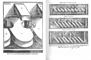 Keyboards of Nicholas Faber's organ for Halberstadt, built in 1361 and enlarged 1495. The illustration is from Praetorius' Syntagma Musicum (1619). At the top is the earliest example of the "seven plus five" layout. الصورتان السفليتان تعرضان النسق المبكر: "ثمانية + أربعة".
