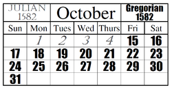 October 4 (Julian) (October 14 Gregorian) – The Julian calendar is discarded at the end of the day in Italy, Poland, Portugal, and Spain as Pope Gregory XIII implements the Gregorian calendar . In the nations where the calendar is accepted, Thursday, October 4 is followed the next day by Friday, October 15 .[2]