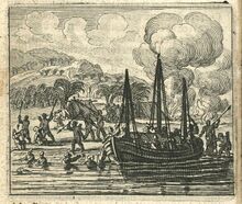 المنبوذون على متن السفينة "Nieuw Hoorn" الهولندية يهاجمهم أهالي سومطرة. النقش من 1654.