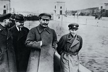 Nikolai Yezhov, walking with Stalin in the top photo from the 1930s. Following his execution, Yezhov was edited out of the photo by Soviet censors.[2] Yezhov became an "unperson".