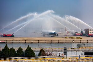مارسBeijing medical team aiding Hubei returned to Beijing on 31 March 2020, with their flight receiving water salute at Beijing Capital International Airport