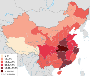 جائحة ڤيروس كورونا في البر الرئيسي للصين 2019-2020 حسب المقاطعة/المدينة[21][22][23]