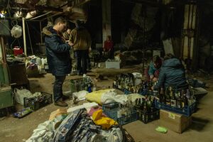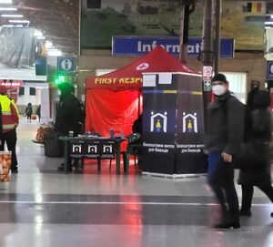 | الإسرائيليون الذين وصلوا من إسرائيل لمحاربة الروس في أوكرانيا، أقاموا في الفندق في كنيس دنيپروپيتروڤسك، مايو 2022. |