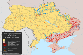 في 24 فبراير 2022، بدأت روسيا اجتياحاً عسكرياً كبيراً على أوكرانيا،[ج] الدولة الأوروبية على حدود جنوب غرب روسيا، في هجوم مفاجئ بدون إعلان حرب، مما يمثل تصعيداً حاداً للصراع الذي بدأ في عام 2014. كما وصف العديد من المسؤولين والمحللين الغزو بأنه أكبر هجوم عسكري تقليدي في أوروبا منذ الحرب العالمية الثانية.[16][17][18] في 5 مارس 2022، أعلنت روسيا وقف إطلاق النار جزئي لفتح ممرات إنسانية لإجلاء المدنيين، والتي بدأت من الساعة 06:00 GMT لتنفيذ عملية الإخلاء.[19][20]