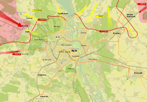 زادت روسيا من الضربات على المطارات والمراكز اللوجستية الأوكرانية، لا سيما في الغرب، في محاولة واضحة لوقف القوات الجوية الأوكرانية وتعطيل إعادة الإمداد من الدول إلى الغرب. في الشمال، وصف معهد ISW قرار استخدام المدفعية الثقيلة في خاركيڤ بأنه "انعطاف خطير". يبدو أن القوات الروسية الإضافية والطوابير اللوجستية في جنوب بيلاروسيا تناور لدعم هجوم كييڤ.[367]كما ذكر محلل في المعهد الملكي للخدمات المتحدة أن الجيش النظامي الأوكراني لم يعد يعمل في التشكيلات ولكن في دفاعات ثابتة إلى حد كبير، وتم دمجه بشكل متزايد مع قوات الدفاع الإقليمية والمتطوعين المسلحين.[368]