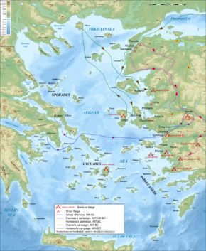 - After a failed attack on the rebellious island of Naxos in ح. 501 BC (on behalf of the Persians), Aristagoras, tyrant of Miletus, to save himself from the wrath of Persia, plans a revolt with the Milesians and the other Ionians. With the encouragement of Histiaeus (his father-in-law and former tyrant of Miletus), Aristagoras induces the Ionian cities of Asia Minor to revolt against Persia, thus instigating the Ionian Revolt and beginning the Greco-Persian Wars between Greece and Persia.[1][2] The pro-Persian tyrant of Mytilene is stoned to death.
