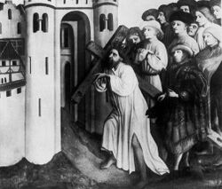 الامبراطور هرقليوس يحمل الصليب، بريشة هانز مولتشر، ح. 1440. |