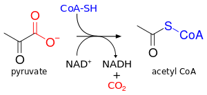 At high glucose levels, acetyl-CoA is produced through glycolysis.[14] Pyruvate undergoes oxidative decarboxylation in which it loses its carboxyl group (as carbon dioxide) to form acetyl-CoA, giving off 33.5 kJ/mol of energy. The oxidative conversion of pyruvate into acetyl-CoA is referred to as the pyruvate dehydrogenase reaction. It is catalyzed by the pyruvate dehydrogenase complex. Other conversions between pyruvate and acetyl-CoA are possible. For example, pyruvate formate lyase disproportionates pyruvate into acetyl-CoA and formic acid.