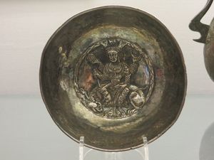 Silver bowl from Khwarezm depicting a four-armed goddess seated on a lion, possibly نانا. Dated 658, British Museum.[10]