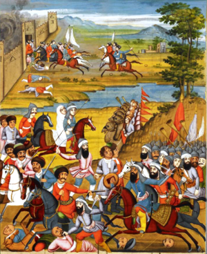 At the same time, Agha Mohammad Khan marched directly on Tbilisi, with half of the army he crossed the Aras river. Some estimate his army had 40,000 men[36] instead of 35,000.[33][41] They attacked the heavily fortified Georgian positions of Heraclius II and Solomon on the southwestern limits of the city. Abandoned by several of his nobles, Heraclius II managed to mobilize around 5,000 troops, including some 2,000 auxiliaries from the neighbouring Imereti under its King Solomon II, a member of the Georgian Bagrationi dynasty and thus distantly related to Heraclius II. The Georgians offered a desperate resistance and succeeded in rolling back a series of Iranian attacks on 9 and 10 September. After that, it is said that some traitors informed the Iranians that the Georgians had no more strength to fight and the Qajar army cancelled their plan of returning to Iran. Early on 11 September, Agha Mohammad Khan personally led an all-out offensive against the Georgians. Amid an artillery duel and a fierce cavalry charge, the Iranians managed to cross the Kura River and outflanked the decimated Georgian army. Heraclius II attempted to mount a counterattack, but he had to retreat to the last available positions in the outskirts of Tbilisi. By nightfall, the Georgian forces had been exhausted and almost completely destroyed. The last surviving Georgian artillery briefly held the advancing Iranians to allow Heraclius II and his retinue of some 150 men to escape through the city to the mountains. The fighting continued in the streets of Tbilisi and at the fortress of Narikala. In a few hours, Agha Mohammad Khan was in full control of the Georgian capital, which was then completely sacked and its population massacred. The Iranian army marched back laden with spoil and carrying off some 15,000 captives.[34][42] The Georgians had lost 4,000 men in the battle, the Iranians 13,000; a third of their total force.[33]