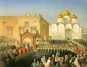 The coronation of Emperor Alexander II and Empress Maria Alexandrovna on 26 August/7 September 1856 في Dormition Cathedral في كرملن موسكو، بريشة ميهالي زيتشي. اللوحة تصور اللحظة التي توّج فيها الإمبراطور الإمبراطورة.