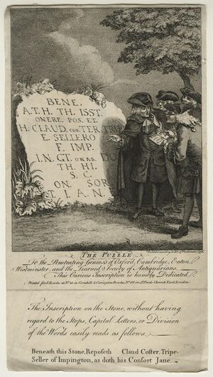 The antiquary was satirised in John Earle's Micro-cosmographie of 1628 ("Hee is one that hath that unnaturall disease to bee enamour'd of old age, and wrinkles, and loves all things (as Dutchmen doe Cheese) the better for being mouldy and worme-eaten"),[20] in Jean-Siméon Chardin's painting Le Singe Antiquaire (c. 1726), in Sir Walter Scott's novel The Antiquary (1816), in the caricatures of Thomas Rowlandson, and in many other places. The New Dictionary of the Terms Ancient and Modern of the Canting Crew of c. 1698 defines an antiquary as "A curious critic in old Coins, Stones and Inscriptions, in Worm-eaten Records and ancient Manuscripts, also one that affects and blindly dotes, on Relics, Ruins, old Customs Phrases and Fashions".[21] In his "Epigrams", John Donne wrote of The Antiquary: "If in his study he hath so much care To hang all old strange things Let his wife beware." The word's resonances were close to those of modern terms for individuals with obsessive interests in technical minutiae, such as nerd, trainspotter or anorak.