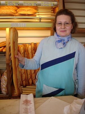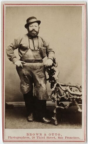 In Europe during the Middle Ages, aprons were worn by blacksmiths, armor and weapon makers, gardeners, carvers, furniture makers, leather smiths, cobblers, tailors, jewelers, metal forgers, fishmongers, clock makers, homemakers, tradesmen, artisans and masons.[7] Tradesmen in general were called "apron men," as aprons were so common that distinguishing styles emerged between the various trades. For example, English barbers were known as "checkered apron men."[8] Cobblers wore black to protect garments from the black wax used on shoes. Butchers wore blue stripes. Butlers wore green aprons. Blue was commonly worn by weavers, spinners, and gardeners. Stonemasons wore white aprons as protection against the dust of their trade, and even in the twenty-first century, aprons survive as part of Masonic ceremonial attire. These aprons were long, coming down to below the knees, with a flap or bib to protect the chest. The Union of the Grand Lodge of England between the Ancient and Modern branches of English Freemasonry in 1813 brought into many effect many changes in dress and ritual which still prevail to this day. In respect to the Masonic apron it was felt necessary to have these standardised and the resulting effort are the aprons we have in use today.[9] The Dutch worn aprons bordered with black and with a skull and crossbones on the flap. Scottish lodges each have their individual right to choose the design, colour and shape of their aprons; some employ a tartan, while many others have a circular rather than a triangular flap.[9] Soldiers of the French Foreign Legion wore leather aprons as part of their ceremonial dress as early as the 18th century.[1]