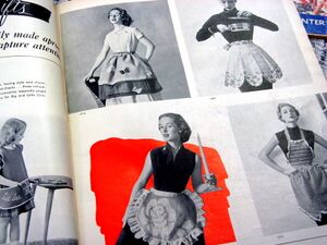 Post-war family values made the apron the symbol of home, family, mother and wife. As sewing machines and cloth became available, aprons—both commercial and homemade—became the uniform of the professional housewife.[8] Magazines from the 1940s and 50s feature apron-adorned women in nearly every advertisement that is related to housework or cooking, including those for irons, kitchen appliances, and food products. The 1950s brought out the half-aprons of highly starched cotton, feedsack,[محل شك] and for special occasions sheer fabric trimmed with lace. Two-piece aprons and short smocks of bright cotton prints for every day use were also popular.