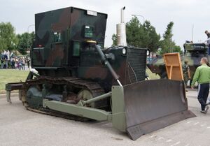 الجرافة المدرعة armored bulldozer هي معدّة أساسية في الهندسة القتالية. These combat engineering vehicles combine the earth moving capabilities of the bulldozer with armor which protects the vehicle and its operator in or near combat. Most are civilian bulldozers modified by addition of vehicle armor/military equipment, but some are tanks stripped of armament and fitted with a dozer blade. Some tanks (called tankdozers) have bulldozer blades while retaining their armament, but this does not make them armored bulldozers as such, because combat remains the primary role — earth moving is a secondary task.