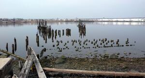 The name Arthur Kill is an anglicization of the Dutch achter kill meaning back channel, which would refer to its location "behind" Staten Island and has its roots in the early 17th century during the Dutch colonial era when the region was part of New Netherland.[2] Placenaming by early explorers and settlers during the era often referred to a location in reference to other places, its shape, its topography, and other geographic qualities.[3] Kill comes from the Middle Dutch word kille, meaning riverbed, water channel, or stream. The area around the Newark Bay was called Achter Kol.[4] During the British colonial era the bay was known as Cull bay.[5] The bay lies behind Bergen Hill, the emerging ridge of the Hudson Palisades which begins on Bergen Neck, the peninsula between it and the Upper New York Bay. The sister channel of Arthur Kill, Kill van Kull refers to the waterway that flows from the col or ridge or passage to the interior and translates as channel from the pass or ridge.