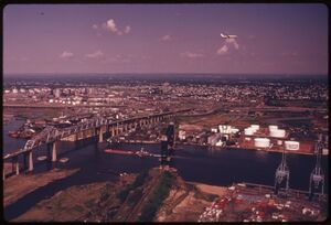 Aerial view of Arthur Kill, with the Rahway River joining from the left and Prall's Island visible near center. | |