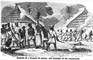 According to John K. Thornton, Europeans usually bought enslaved people who had been captured in endemic warfare between African states.[3] Some Africans had made a business out of capturing war captives or members of neighboring ethnic groups and selling them.[90] A reminder of this practice is documented in debates over the trade in the British Parliament in 1806: "All the old writers ... concur in stating not only that wars are entered into for the sole purpose of making slaves, but that they are fomented by Europeans, with a view to that object."[91] People living around the Niger River would be transported from these markets to the coast and sold in European trading ports, in exchange for muskets and manufactured goods such as cloth or alcohol.[92] The European demand for slaves provided a new and larger market for the already existing trade.[93] While those held as slaves in their own region of Africa could hope to escape, those shipped away had little chance of returning to their homeland.[94]