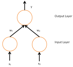 To understand the mathematical derivation of the backpropagation algorithm, it helps to first develop some intuition about the relationship between the actual output of a neuron and the correct output for a particular training example. Consider a simple neural network with two input units, one output unit and no hidden units, and in which each neuron uses a linear output (unlike most work on neural networks, in which mapping from inputs to outputs is non-linear)[خ] that is the weighted sum of its input.