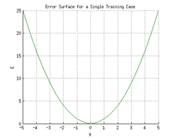 Consider the network on a single training case: . Thus, the input and are 1 and 1 respectively and the correct output, t is 0. Now if the relation is plotted between the network's output y on the horizontal axis and the error E on the vertical axis, the result is a parabola. The minimum of the parabola corresponds to the output y which minimizes the error E. For a single training case, the minimum also touches the horizontal axis, which means the error will be zero and the network can produce an output y that exactly matches the target output t. Therefore, the problem of mapping inputs to outputs can be reduced to an optimization problem of finding a function that will produce the minimal error.