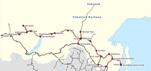 At Tynda the route is crossed by the Amur–Yakutsk Mainline, which runs north to Neryungri and Tommot, with an extension to Nizhny Bestyakh opened in 2019.[5] The original section of the AYaM connecting the Trans-Siberian at Bamovskaya with the BAM at Tynda is also referred to as the "Little BAM".