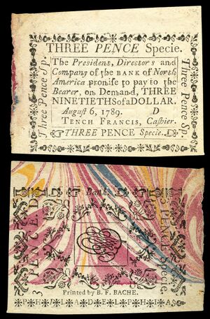 Three pence issued by the Bank of North America on August 6, 1789, printed by Benjamin Franklin Bache on marbled paper obtained by Benjamin Franklin.[6]