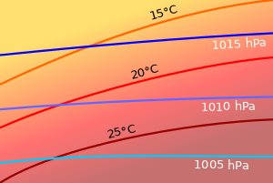In Earth's atmosphere, barotropic flow is a better approximation in the tropics, where density surfaces and pressure surfaces are both nearly level, whereas in higher latitudes the flow is more baroclinic.[3] These midlatitude belts of high atmospheric baroclinity are characterized by the frequent formation of synoptic-scale cyclones,[4] although these are not really dependent on the baroclinity term per se: for instance, they are commonly studied on pressure coordinate iso-surfaces where that term has no contribution to vorticity production.