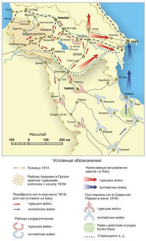 The Battle of Baku (آذربيجاني: Bakı döyüşü, روسية: Битва за Баку, تركية: Bakü Muharebesi) was a battle in World War I that took place on August–September 1918 between the OttomanAzerbaijani coalition forces led by Nuri Pasha and BolshevikDashnak Baku Soviet forces, later succeeded by the BritishArmenianWhite Russian forces led by Lionel Dunsterville and saw briefly Soviet Russia renter the war. The battle was fought as a conclusive part of the Caucasus Campaign, but as a beginning of the Armenian–Azerbaijani War.[5][6]