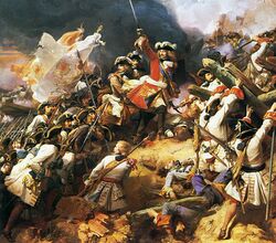 Marshal Villars leads the French charge at the Battle of Denain. Oil on canvas, 1839. (Galerie des Batailles, قصر ڤرساي)